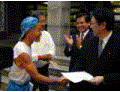 いきなりですが、厚生大臣に面会かなって要望書を手渡しているところです。この日国会は空転中で直前まで面会不能との回答でしたが、休会しているわずかな時間にタイミングよく面会することができました。