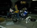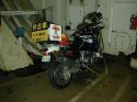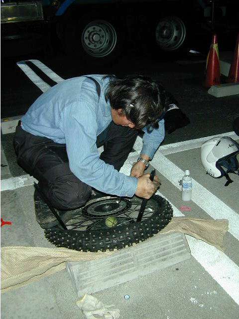 雪の北海道上陸にそなえて、バイクのタイヤ交換。ちなみにのりべーは、前が下がらないように、重りのやくめ。(18:32) |