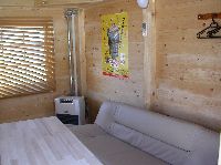 キャビンの内部はFF式石油ストーブがあり、快適です。排気の位置が高いのは、それだけ積雪があってもストーブが機能するように設置されているという事です。 |